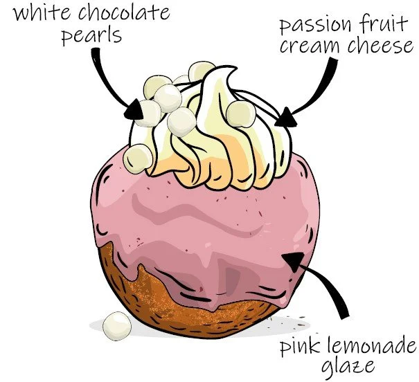 Who needs Madison County’s Bridges when Middlesex County has this donut! Our rich poppyseed cake donut, dunked in a tangy pink lemonade glaze, topped with a sweet passionfruit cream cheese frosting and white chocolate pearls.